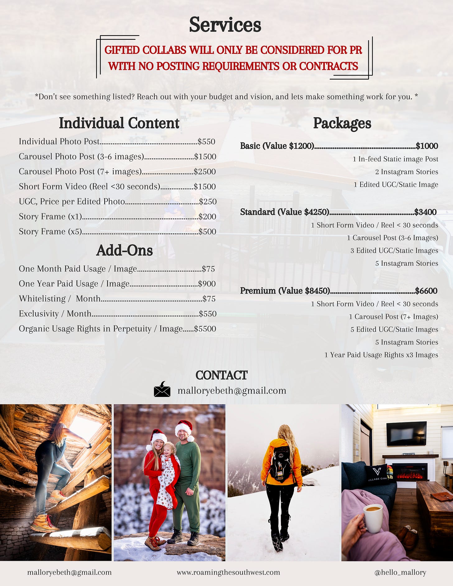 Please note I only accept hosted collaborations if we will already be traveling in the area. If we are, I will include unlimited stories + 1 collaborative reel for the stay. Otherwise, rates apply as listed above.